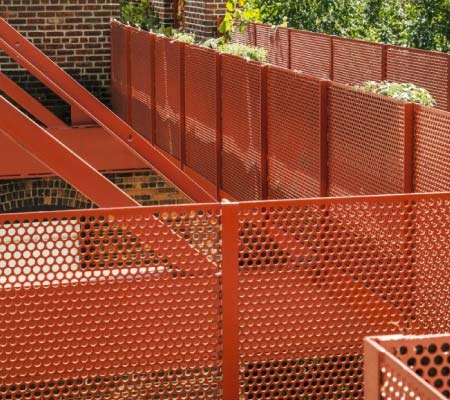 La chapa perforada también puede aplicarse como elemento de seguridad arquitectónica, en protecciones para balcones, escaleras, puentes, piscinas, decks y precipicios. Sus propiedades permiten combinar resistencia, durabilidad y estética.