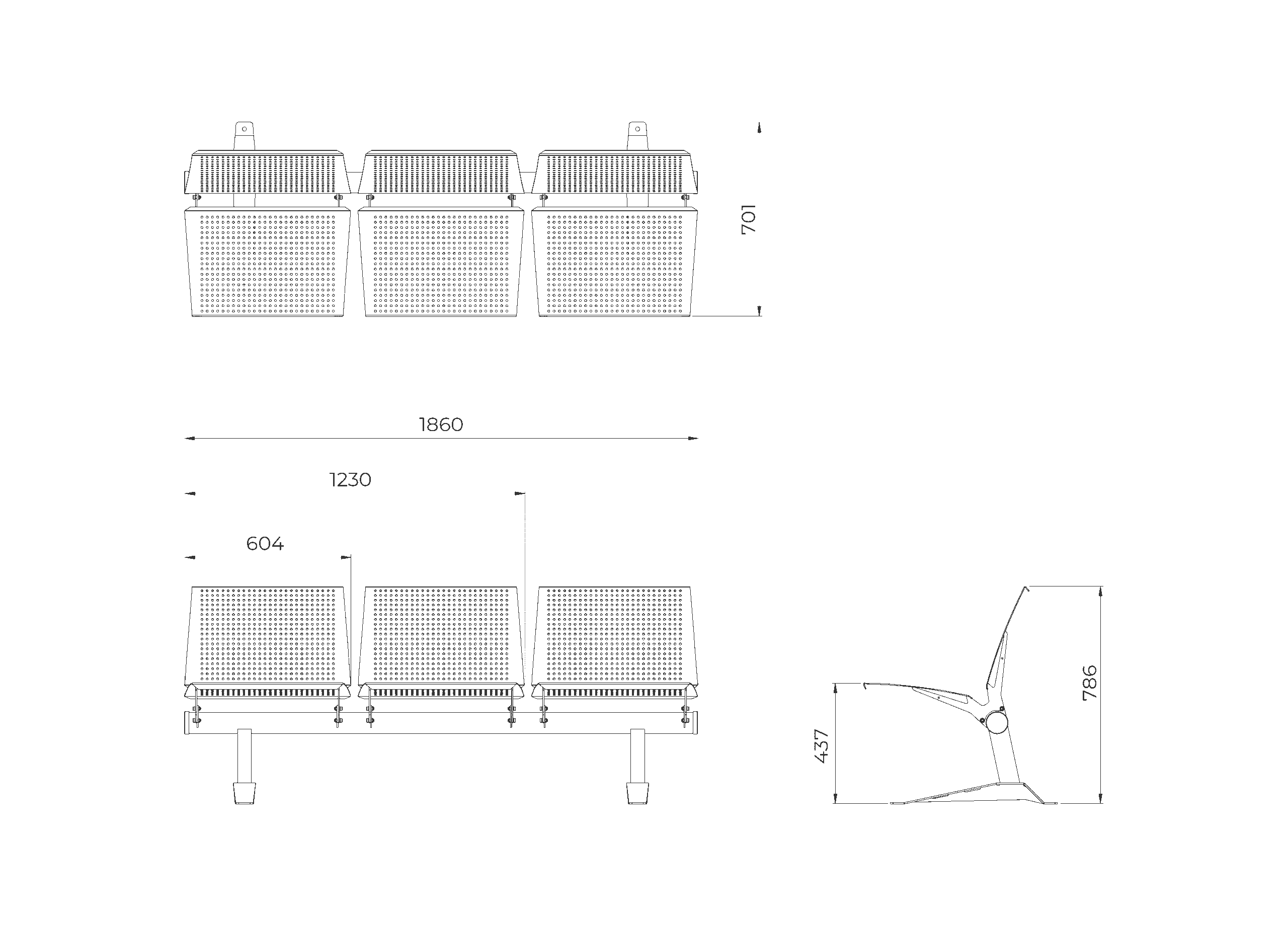 Sus butacas desmontables permiten múltiples configuraciones según las preferencias del cliente. Pueden intercambiarse por asientos de diferentes tamaños, con o sin respaldo, o incluso por mesas de vidrio, chapa lisa o chapa perforada, logrando un sistema versátil que combina comodidad, resistencia y diseño adaptable.