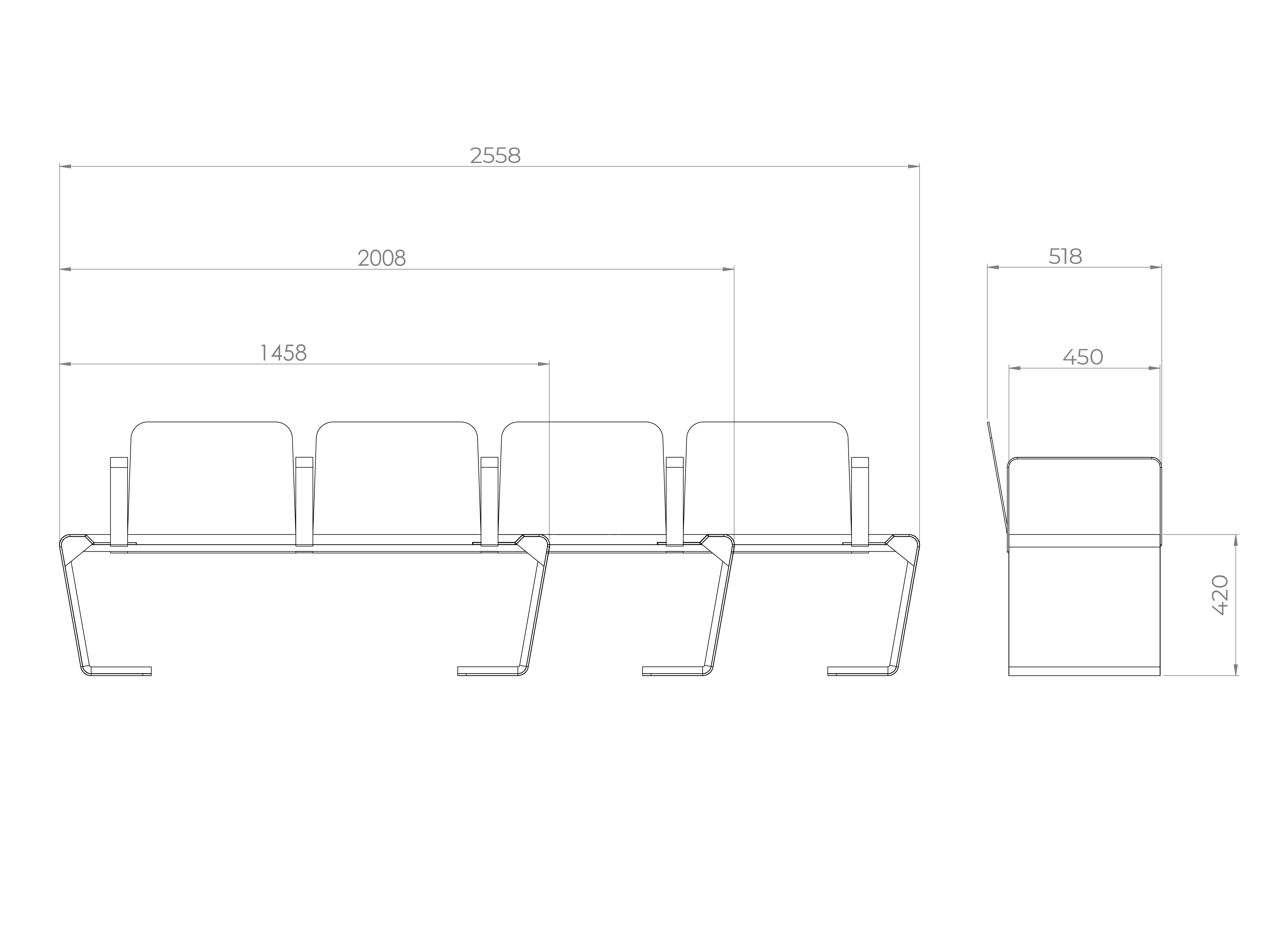 Fabricado en chapa de 6.35 mm de espesor, ofrece una gran resistencia y durabilidad, siendo apto tanto para interiores como para exteriores y especialmente adecuado para espacios de alto tránsito o esperas prolongadas.